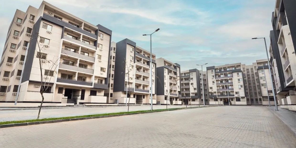 The buildings are multi-story apartment complexes, typically around five to seven floors high. They feature a combination of color palettes, including light and dark tones of gray, brown, and beige.